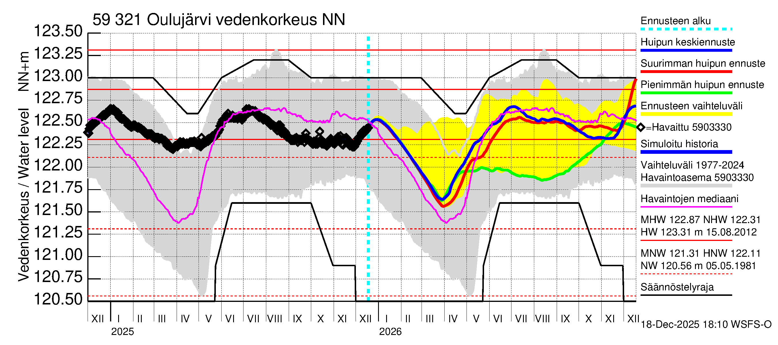Oulujoen vesistöalue - Oulujärvi Vuottolahti: Vedenkorkeus - huippujen keski- ja ääriennusteet