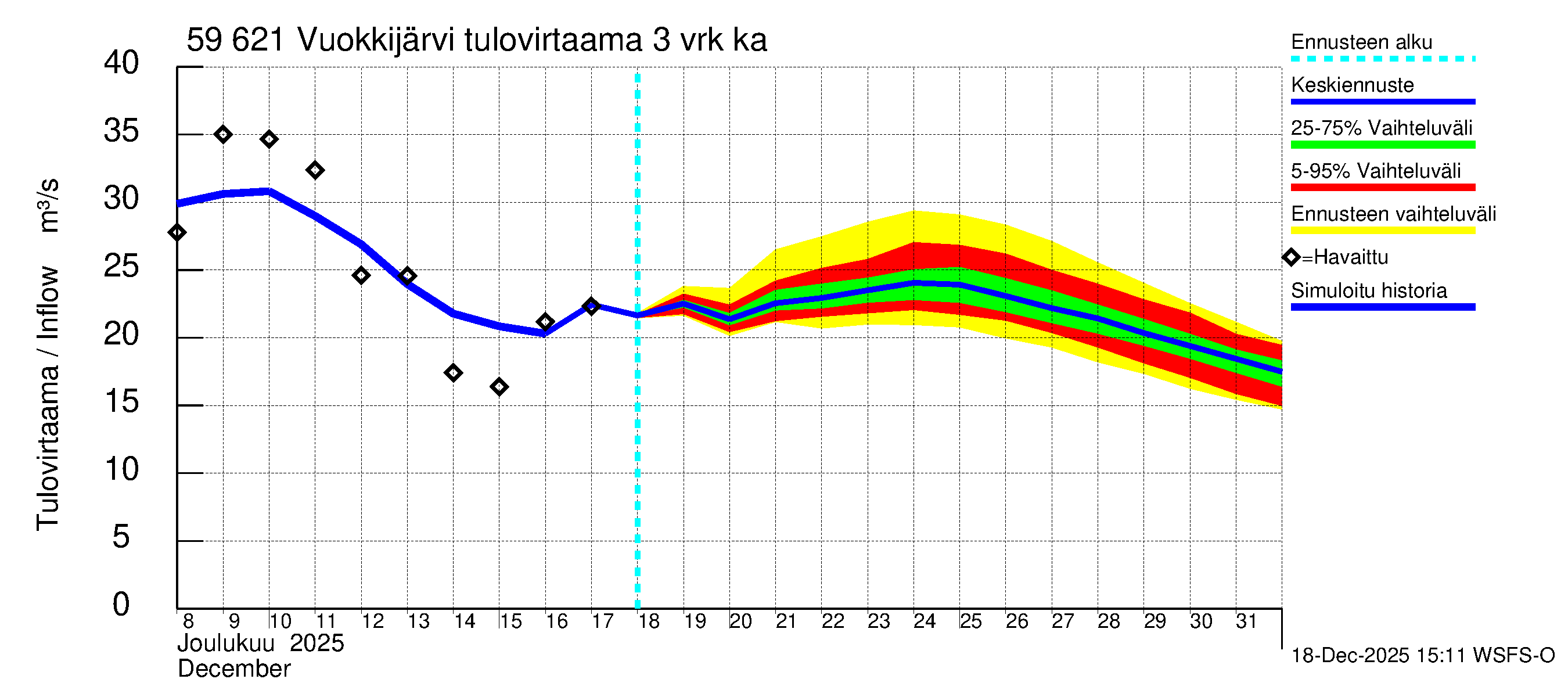 Oulujoen vesistöalue - Vuokkijärvi: Tulovirtaama (usean vuorokauden liukuva keskiarvo) - jakaumaennuste