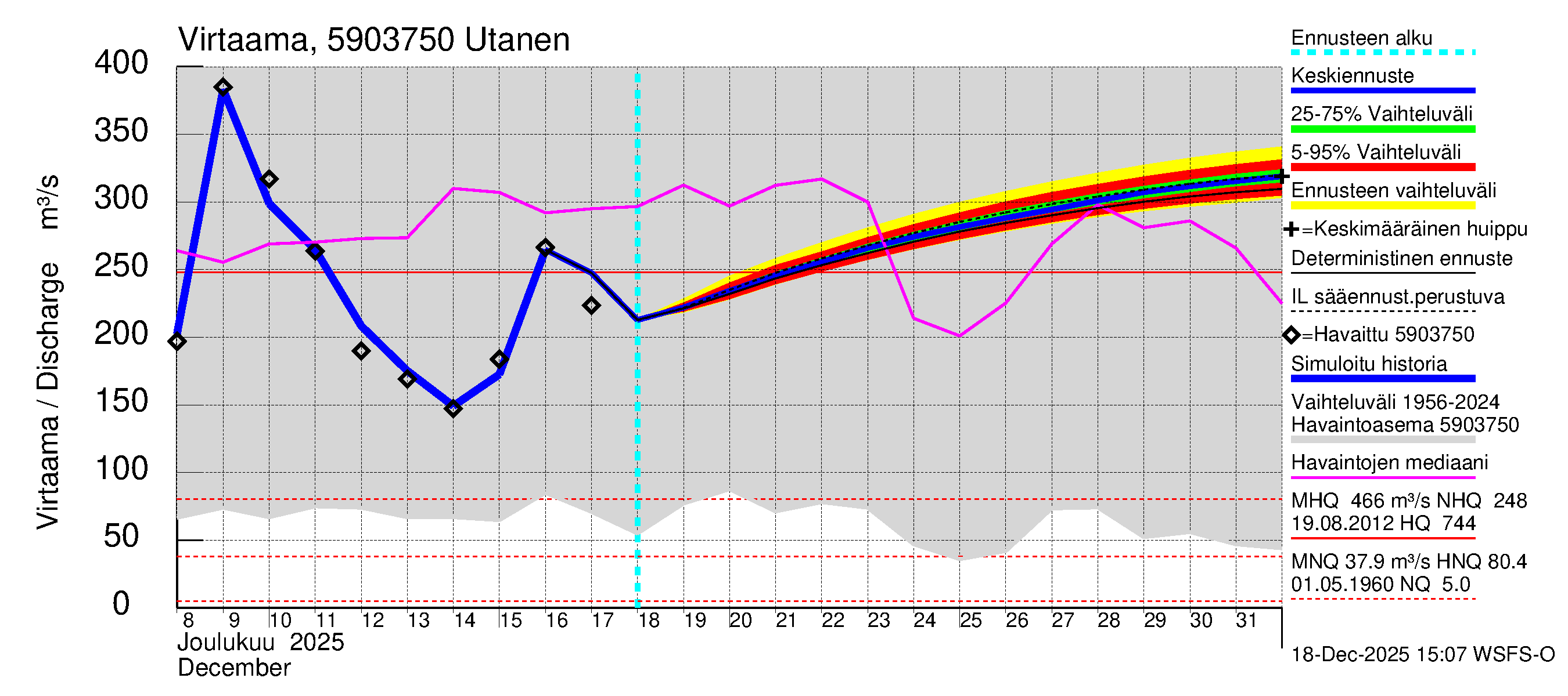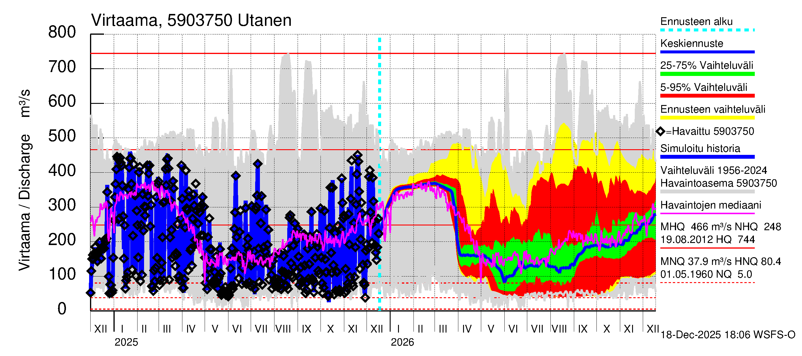 Oulujoen vesistöalue - Utanen: Virtaama / juoksutus - huippujen keski- ja ääriennusteet