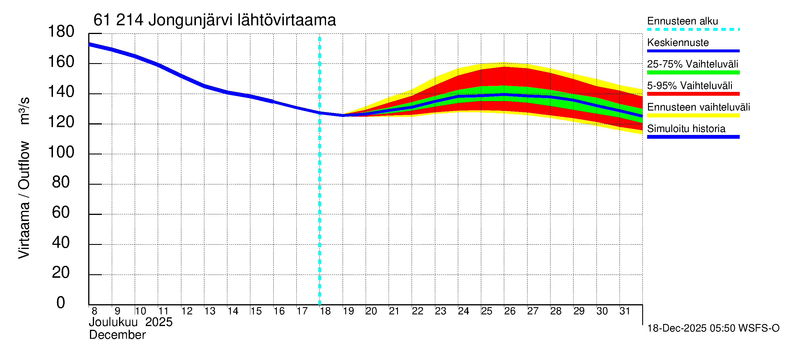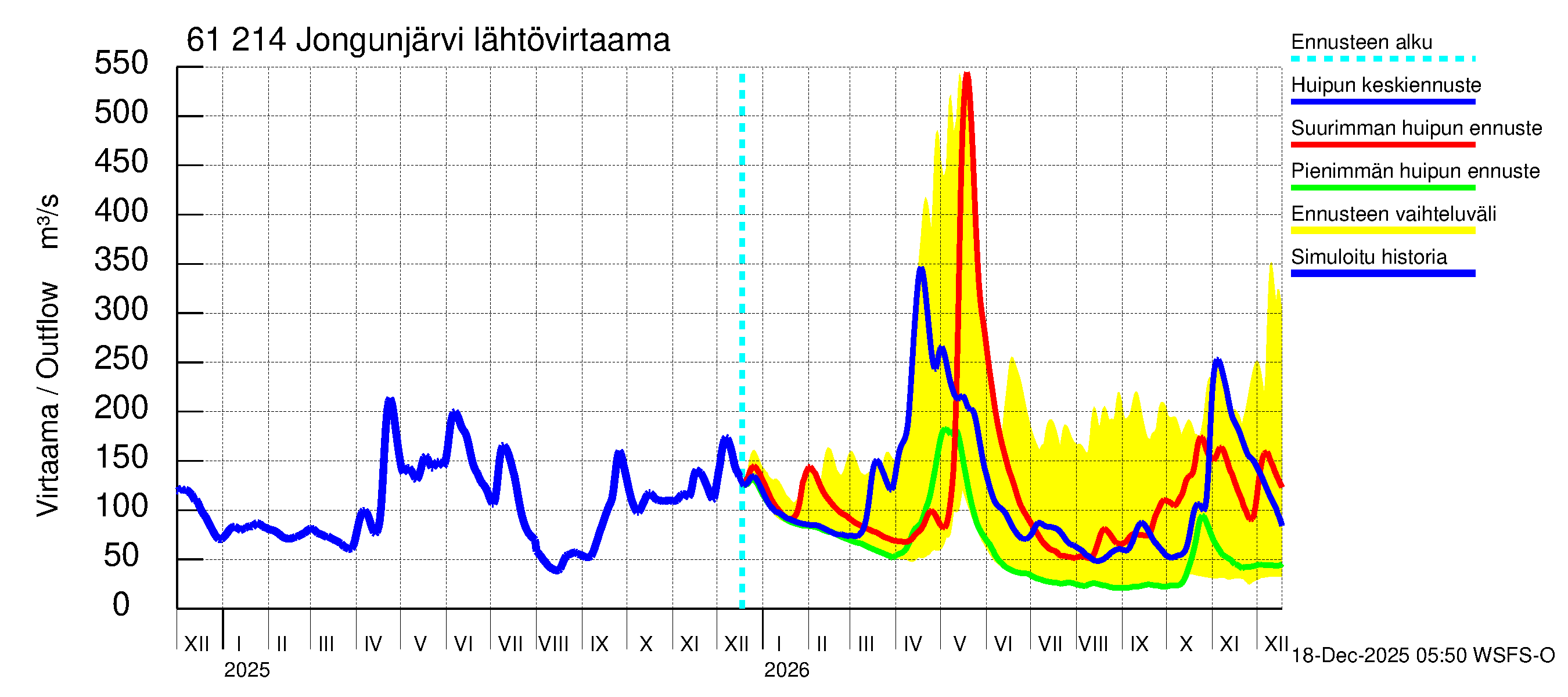 Iijoen vesistöalue - Jongunjärvi: Lähtövirtaama / juoksutus - huippujen keski- ja ääriennusteet