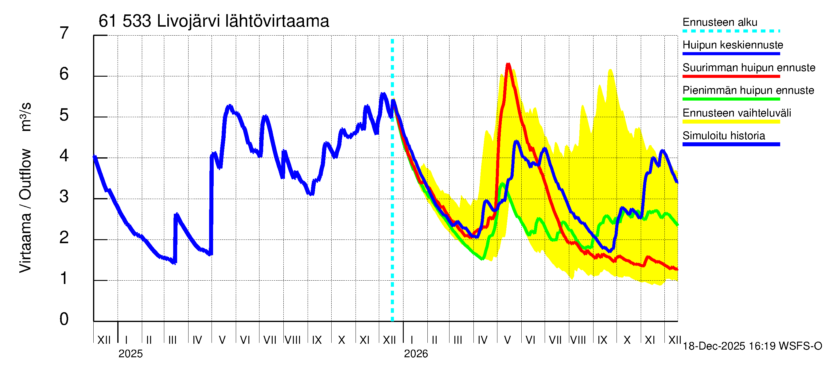 Iijoen vesistöalue - Livojärvi: Lähtövirtaama / juoksutus - huippujen keski- ja ääriennusteet