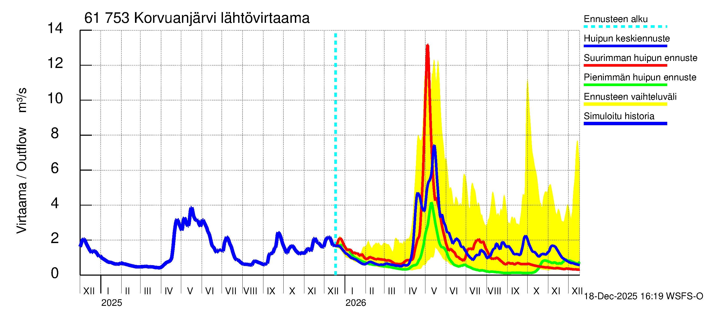 Iijoen vesistöalue - Korvuanjärvi: Lähtövirtaama / juoksutus - huippujen keski- ja ääriennusteet