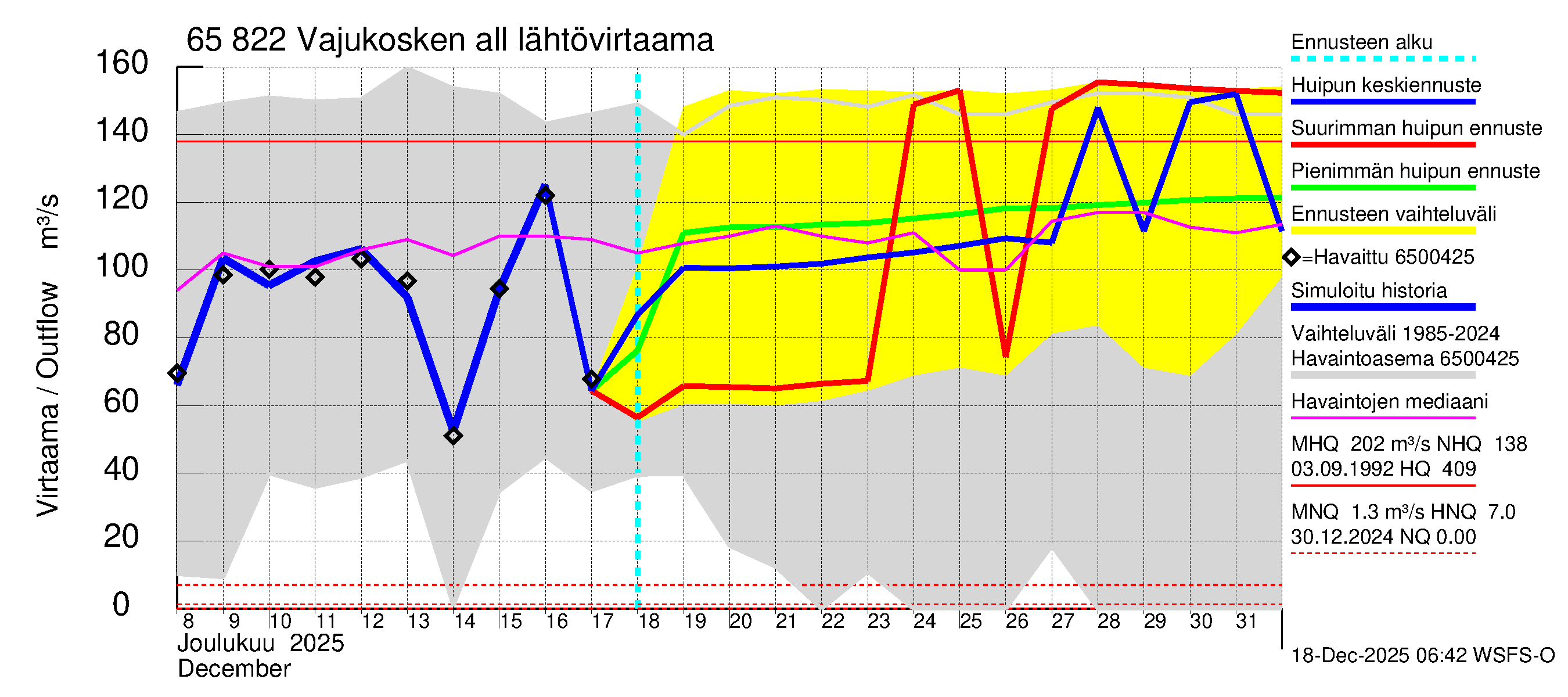 Kemijoen vesistöalue - Vajukosken allas: Lähtövirtaama / juoksutus - huippujen keski- ja ääriennusteet