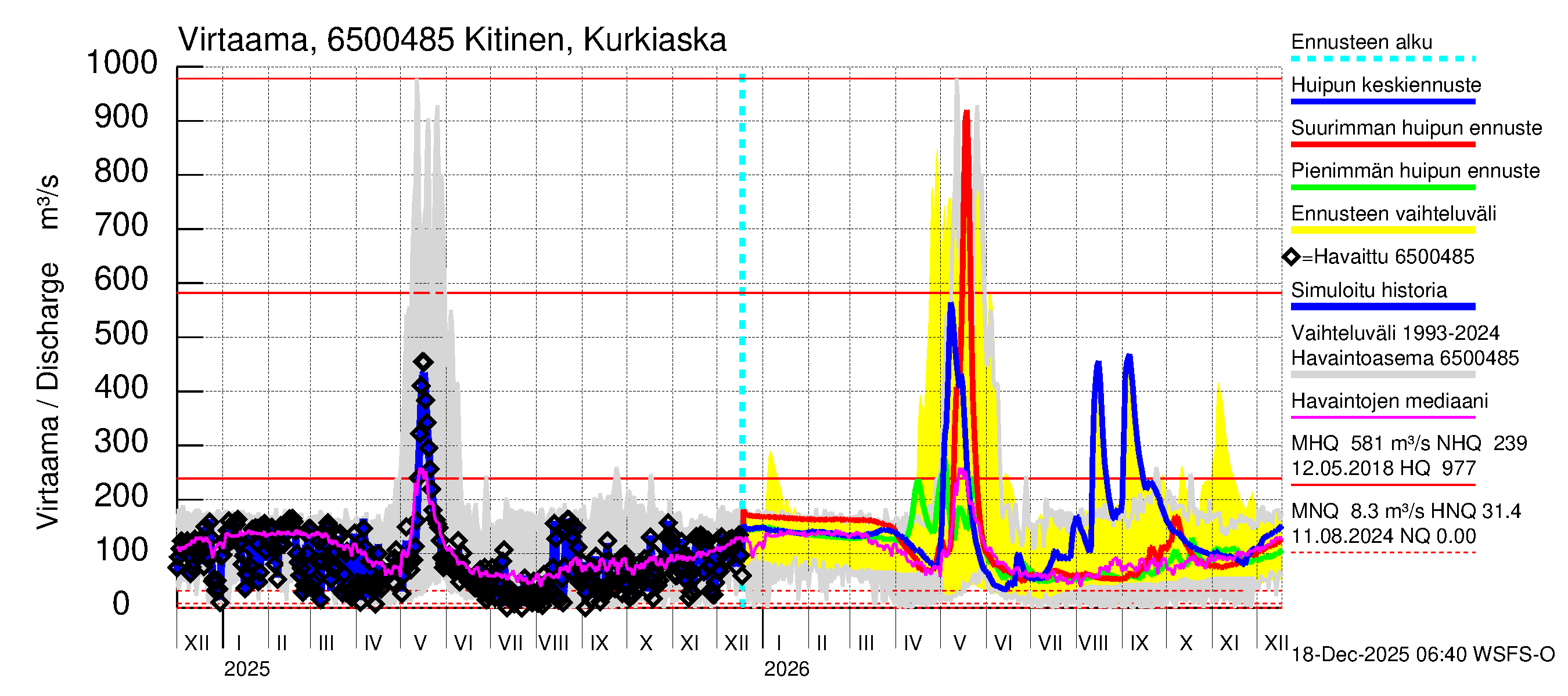 Kemijoen vesistöalue - Kitinen Kurkiaska: Virtaama / juoksutus - huippujen keski- ja ääriennusteet