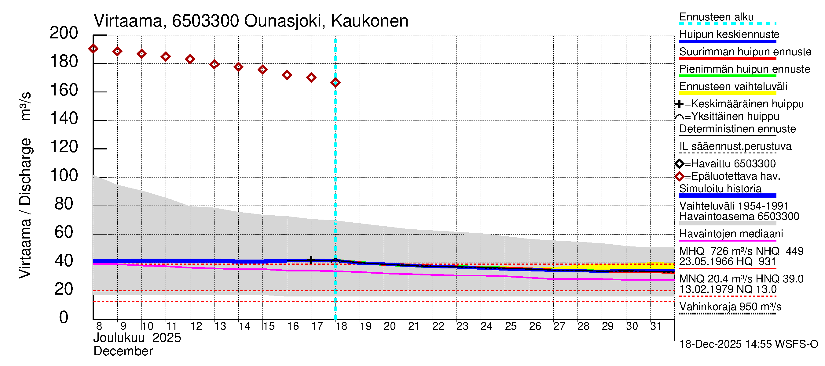 Kemijoen vesistöalue - Ounasjoki Kaukonen: Virtaama / juoksutus - huippujen keski- ja ääriennusteet