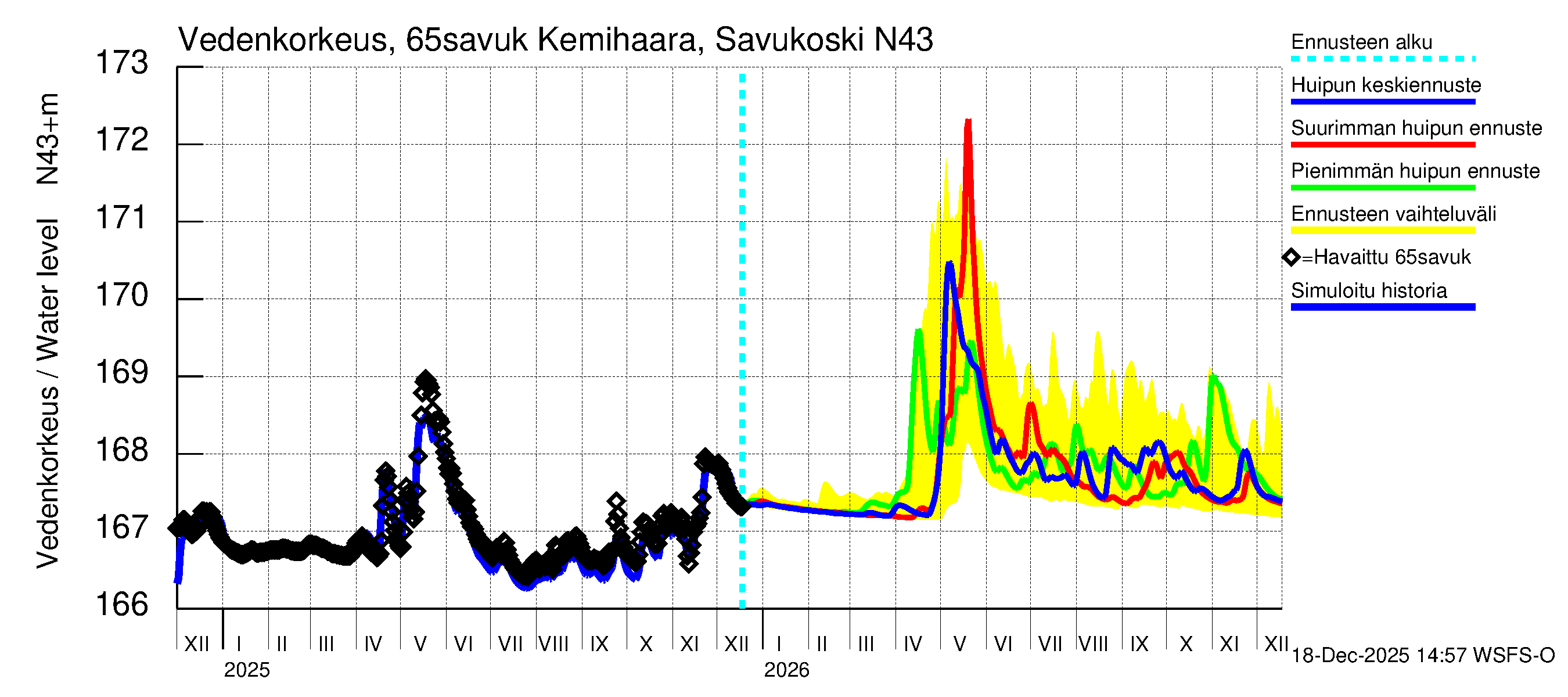 Kemijoen vesistöalue - Kemihaara Savukoski: Vedenkorkeus - huippujen keski- ja ääriennusteet