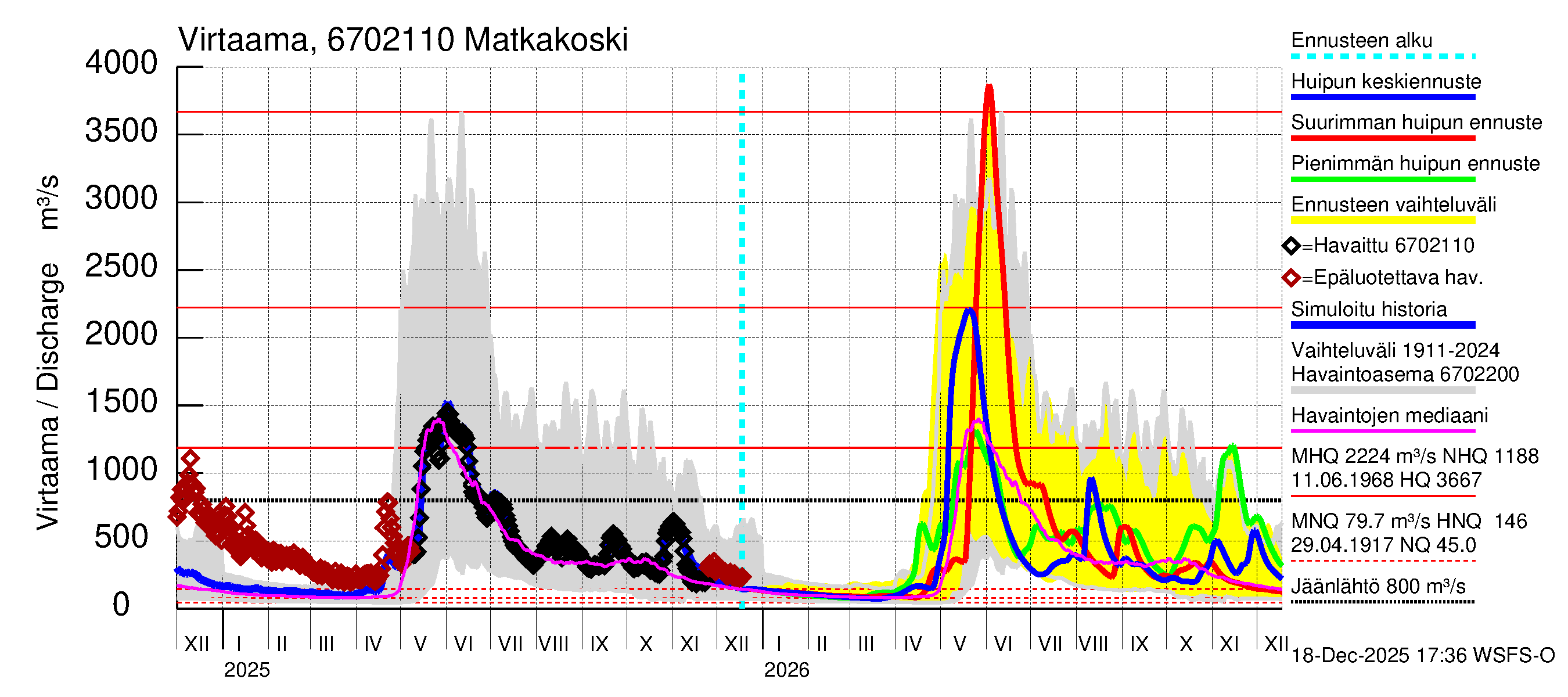 Tornionjoen vesistöalue - Matkakoski: Virtaama / juoksutus - huippujen keski- ja ääriennusteet