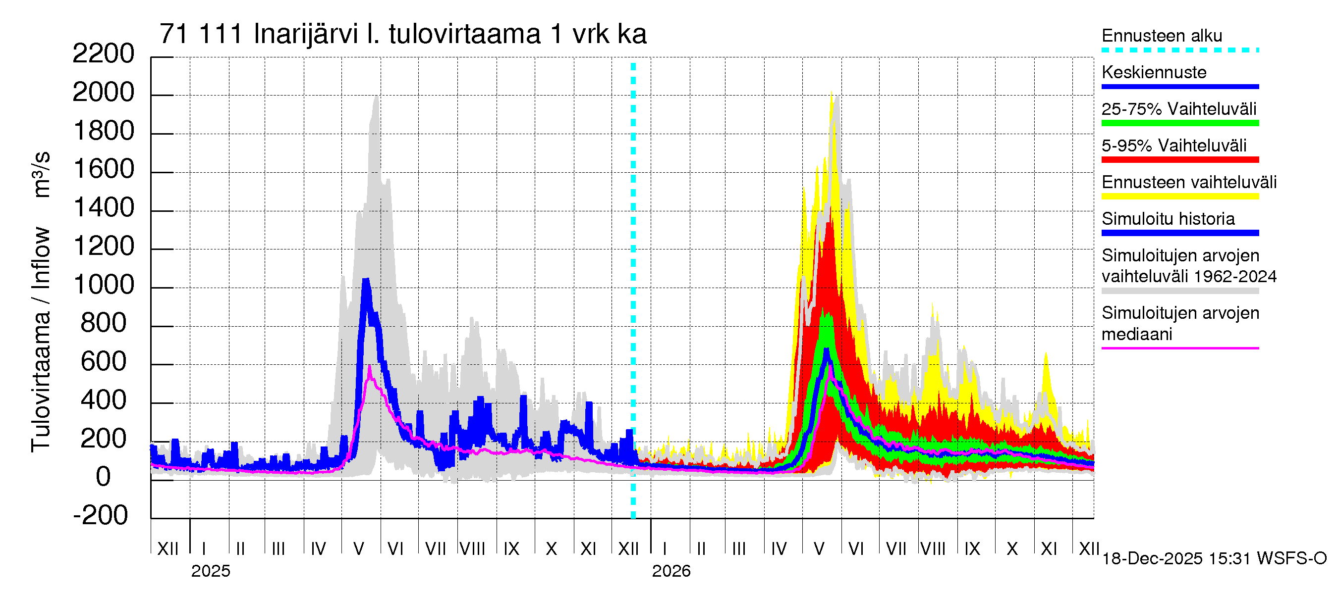 Paatsjoen vesistöalue - Inarijärvi Inari: Tulovirtaama (usean vuorokauden liukuva keskiarvo) - jakaumaennuste