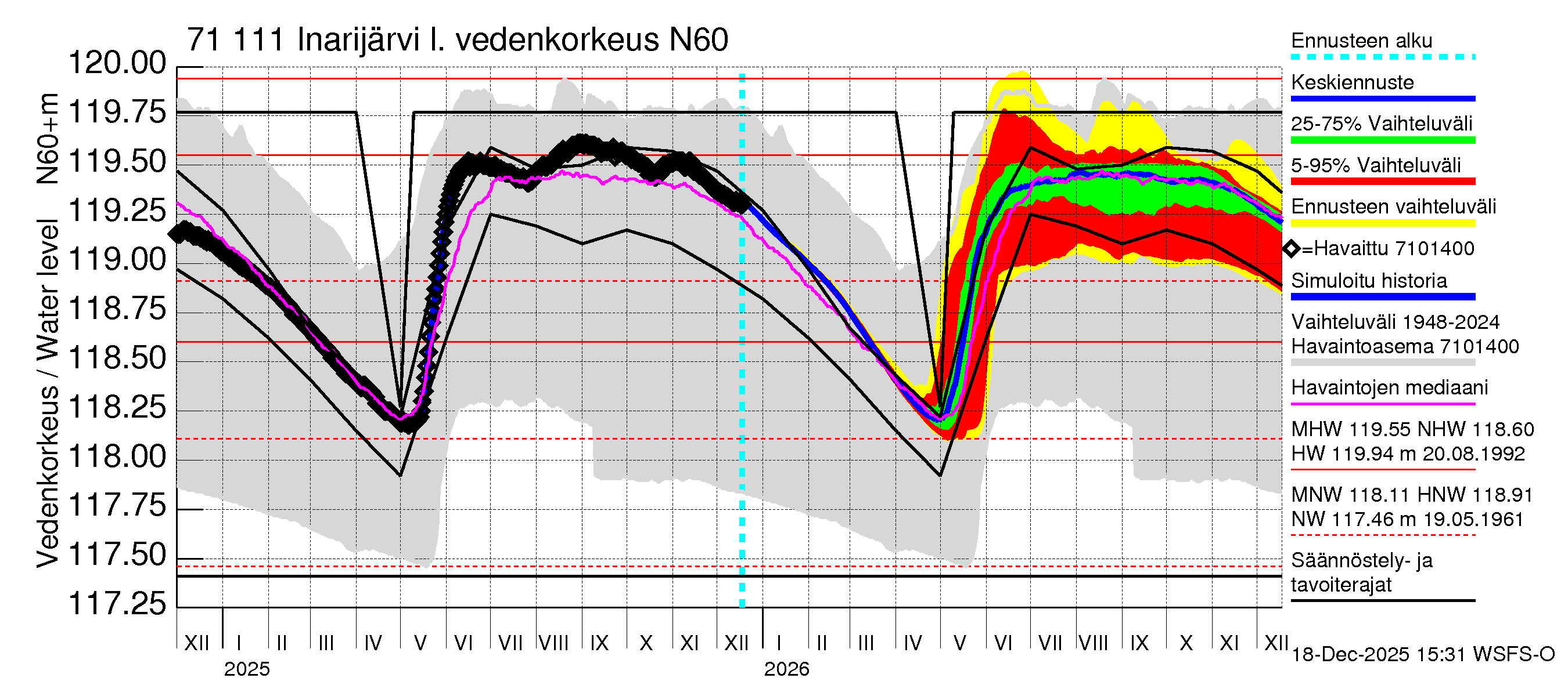 Paatsjoen vesistöalue - Inarijärvi Inari: Vedenkorkeus - huippujen keski- ja ääriennusteet