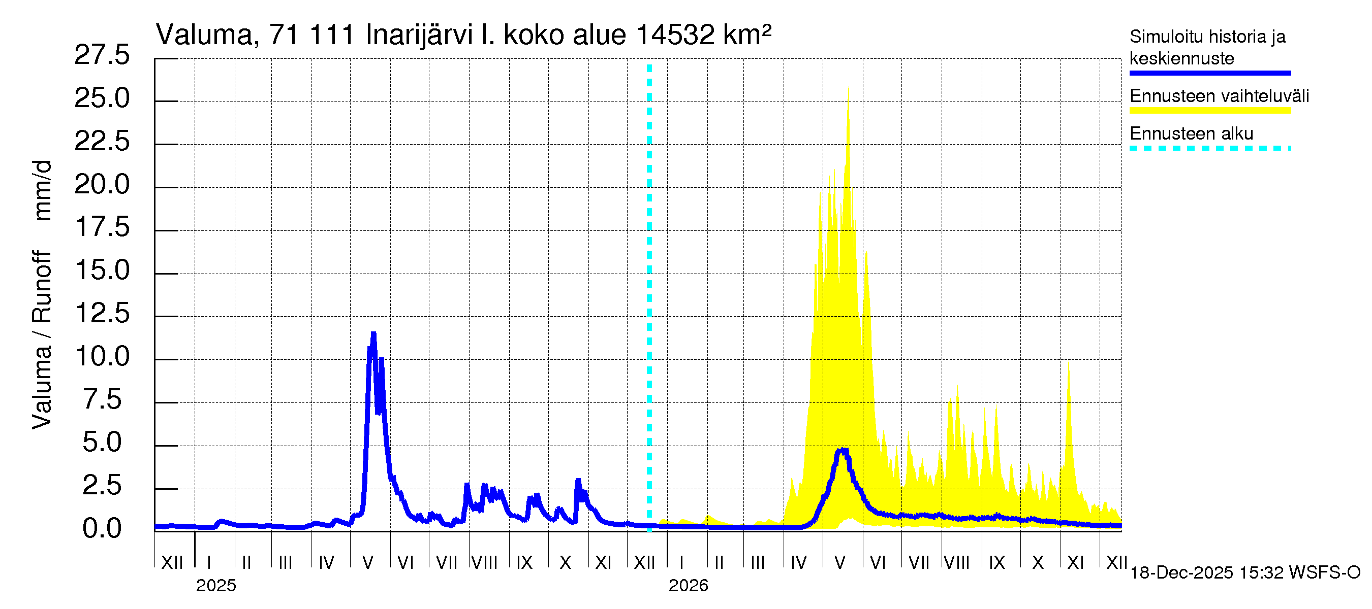 Paatsjoen vesistöalue - Inarijärvi Nellim: Lähtövirtaama / juoksutus - huippujen keski- ja ääriennusteet