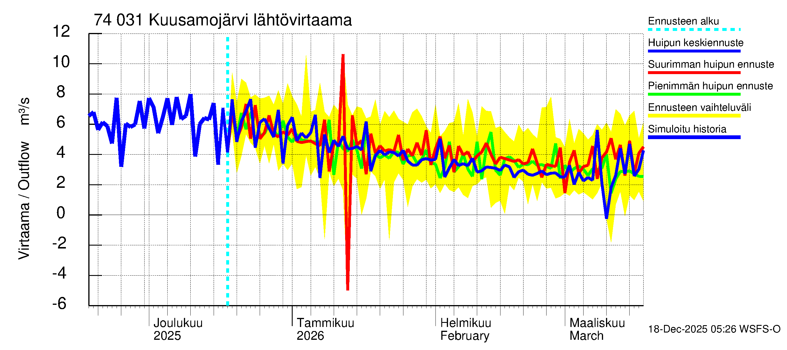 Vienan Kemin vesistöalue - Kuusamojärvi: Lähtövirtaama / juoksutus - huippujen keski- ja ääriennusteet