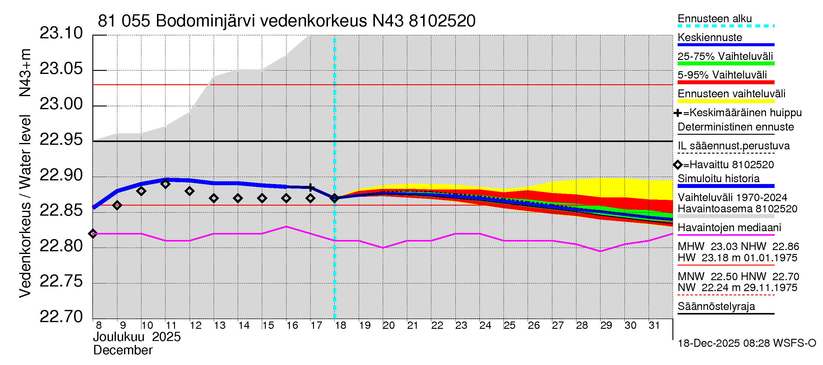 Mankin- ja Espoonjoen vesistöalue - Bodominjärvi: Vedenkorkeus - huippujen keski- ja ääriennusteet