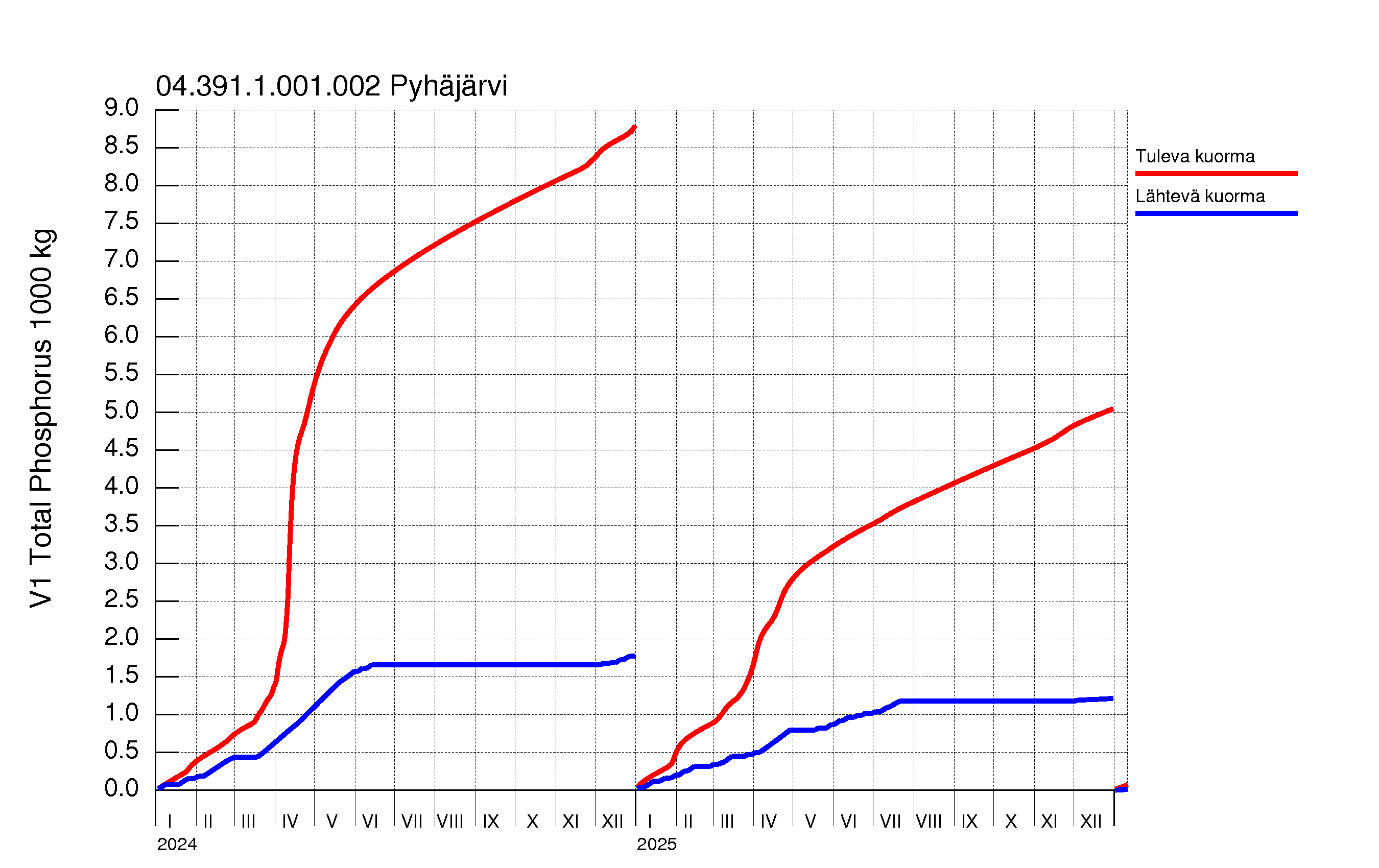 WSFS-Vemala: Kokonaisfosforikuormitus: Vuoksen vesistöalue - PyhäjärviAsiantuntijan työpöytä > Ravinnekuormitus > Suomenlahti (Laatokka) > Vuoksen vesistöalue > PyhäjärviFOSFORI | TYPPI | KIINTOAINE
