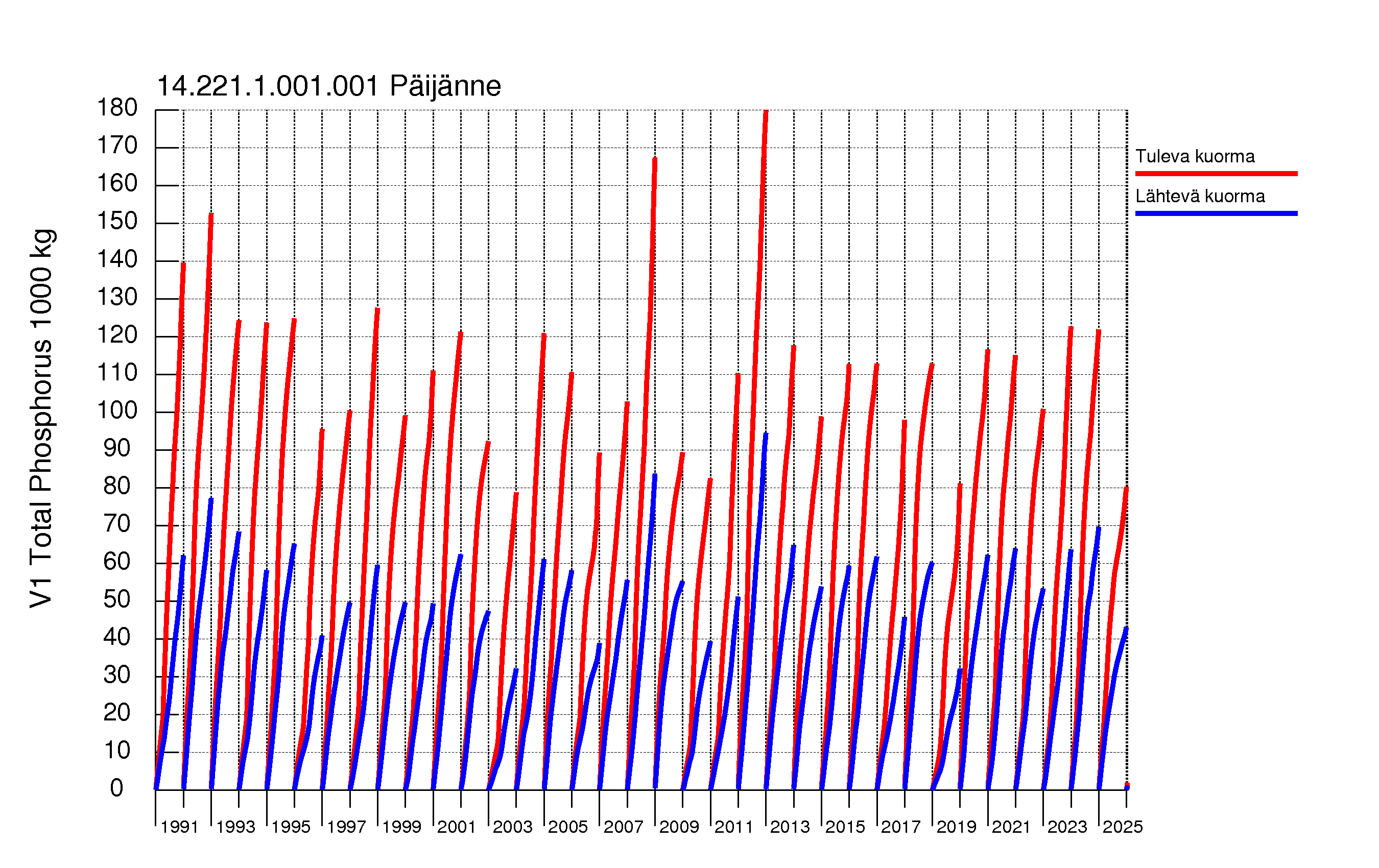 WSFS-Vemala: Kokonaisfosforikuormitus: Kymijoen vesistöalue - PäijänneAsiantuntijan työpöytä > Ravinnekuormitus > Suomenlahti > Kymijoen vesistöalue > PäijänneFOSFORI | TYPPI | KIINTOAINE