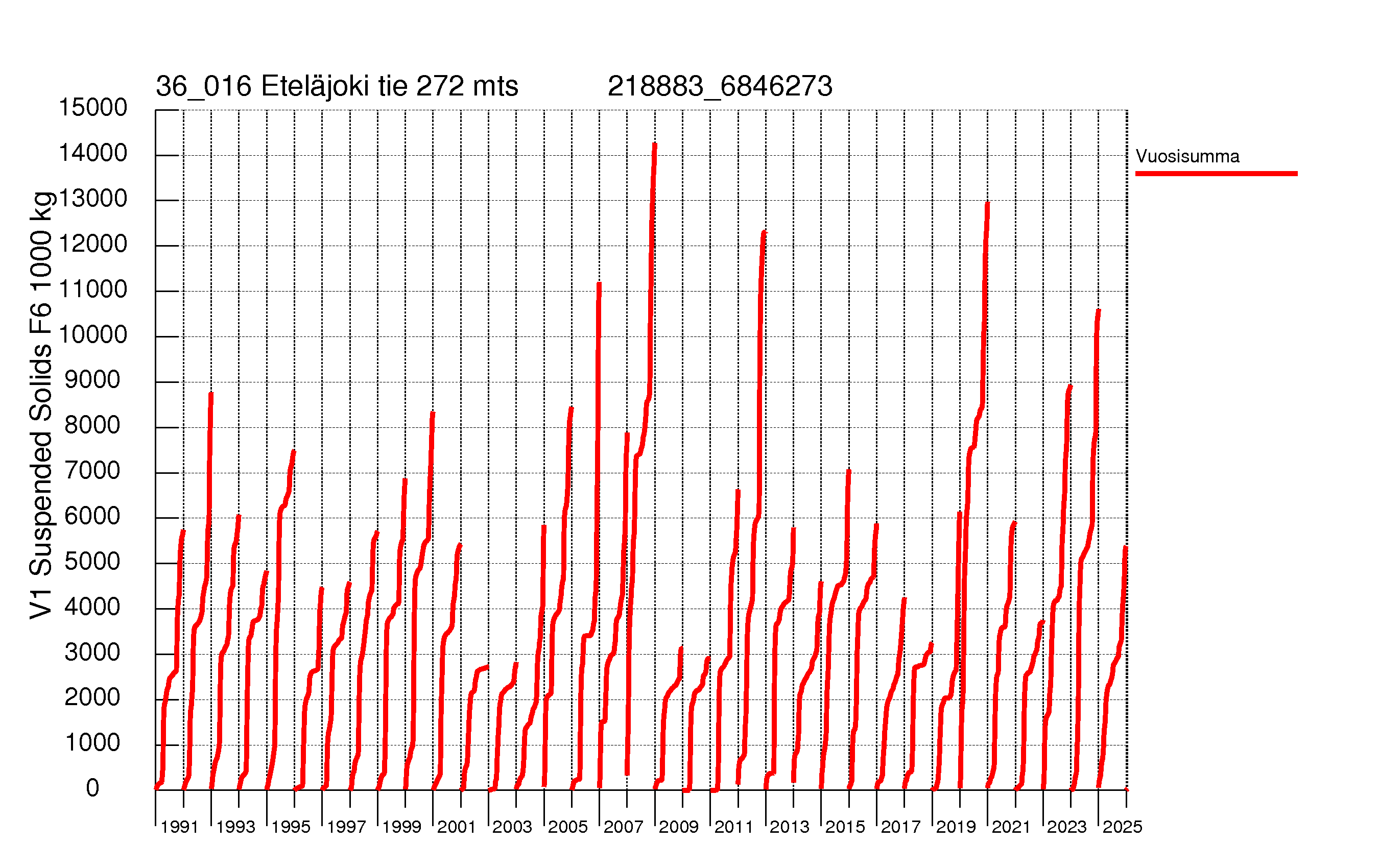 WSFS-Vemala: Kokonaiskiintoainekuormitus: Karvianjoen vesistöalue - Eteläjoki tie 272 mtsAsiantuntijan työpöytä > Ravinnekuormitus > Selkämeri > Karvianjoen vesistöalue > Eteläjoki tie 272 mtsFOSFORI | TYPPI | KIINTOAINE
